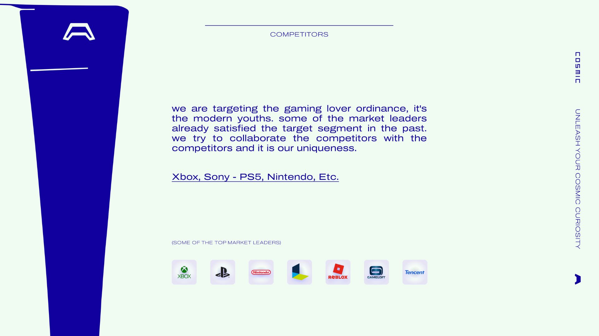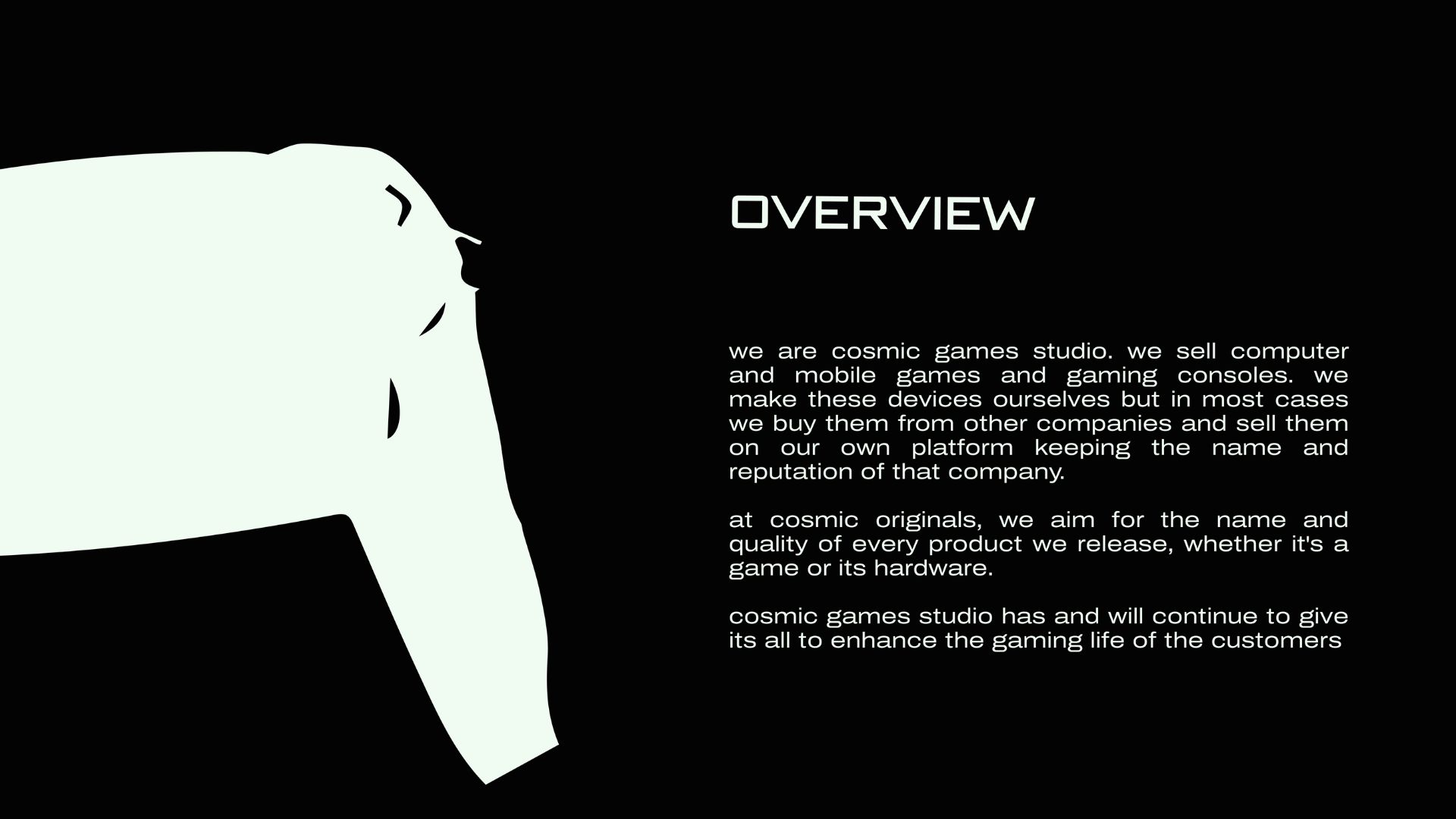 We are cosmic games studio. we sell computer and mobile games and gaming consoles. we make these devices ourselves but in most cases we buy them from other companies and sell them on our own platform keeping the name and reputation of that company. At cosmic originals, we aim for the name and quality of every product we release. Cosmic games studio has and will continue to give its all to enhance the gaming life of the customers